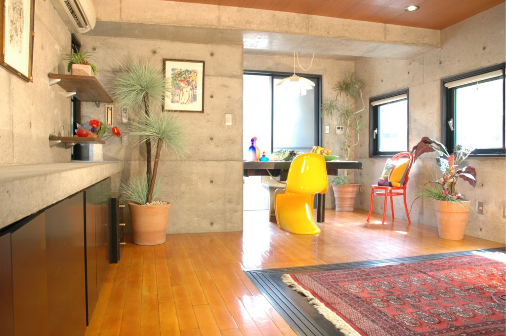 外から内へ1歩足を踏み込むと外観の閉ざされた表情からは想像もできない高い吹抜け空間と、迷路の様なトンネルを抜けると突然、緑豊かな中庭が望める共用空間の演出に驚きました!! 私はデザイナーズマンション特集TV放送を見て富士不動産さんを知り、問合せをすると満室でしたので、希望の予算と広さを伝えておいたら、3ヵ月後に空室の連絡があり案内を受けました。 案内していただいた部屋は中庭沿いの独立した角部屋で、まるで隠れ家のようでした。 居室は壁も天井もカウンター台までもがコンクリート打放しでクールな雰囲気のなか、リビングの窓からは中庭の緑が望められ、コンクリートハウスにあこがれていた私は即決しました。 週末に友人が訪れた時には中庭のテーブルでお茶をして楽しむこともでき、癒し系の中庭にはコンクリート生活者に一刻の安らぎをもたらしてくれます。 |