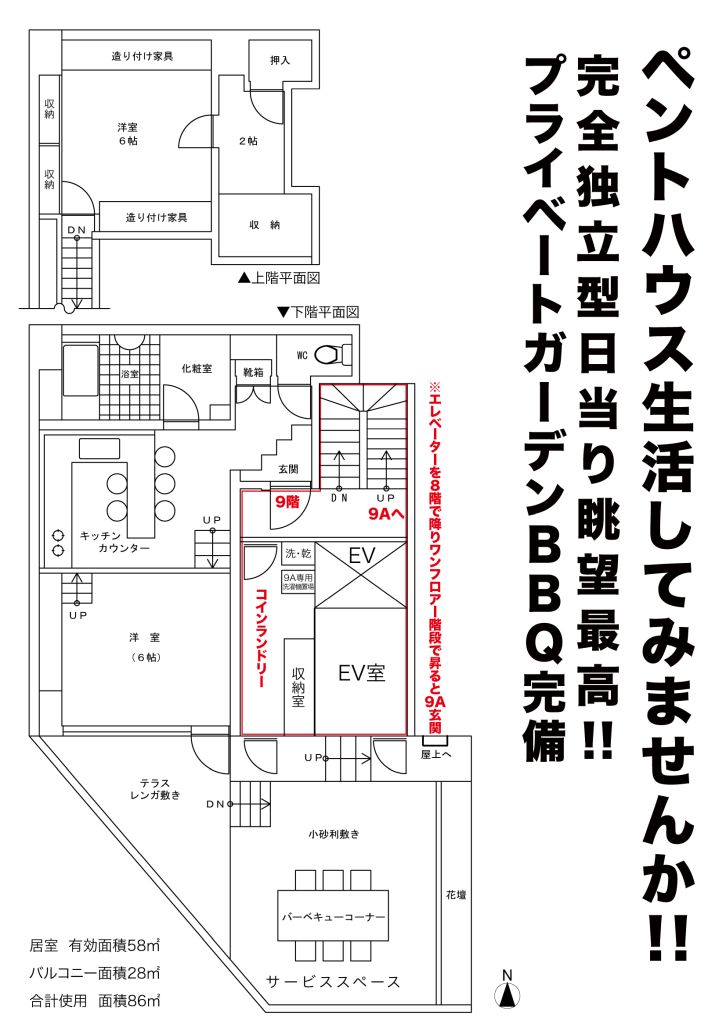 | 9階A号室 (面積:58.00㎡、17.54坪) 坪当単価 (バル含む) 9,120円 | |||